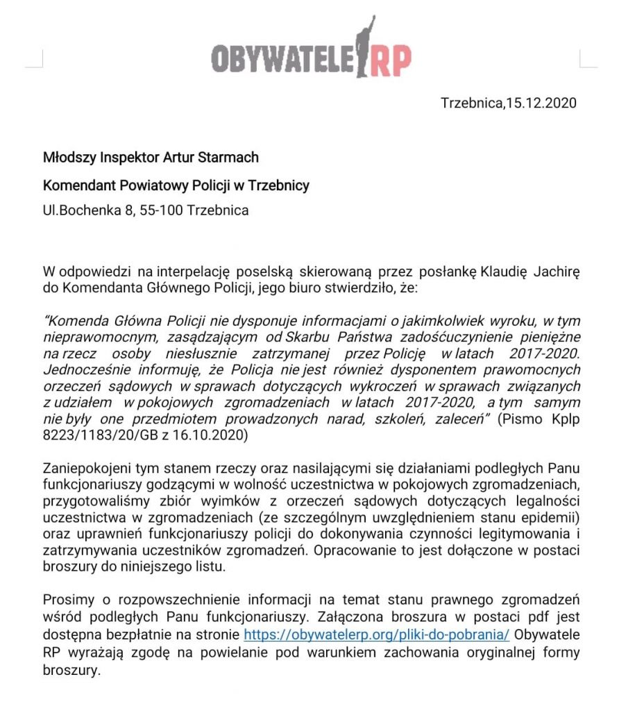 Do listu Obywatele RP dołączyli broszurę z orzeczeniami sądowymi w sprawach o udział w zgromadzeniach (ze szczególnym uwzględnieniem stanu epidemii) oraz uprawnieniami funkcjonariuszy policji do dokonywania czynności legitymowania i zatrzymywania uczestników zgromadzeń.